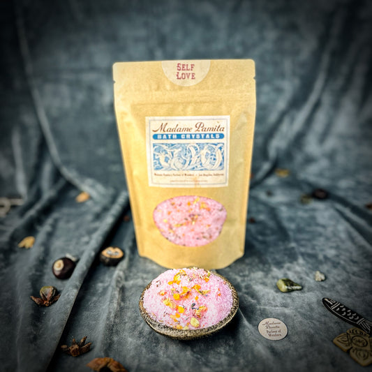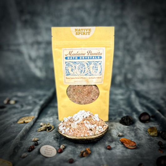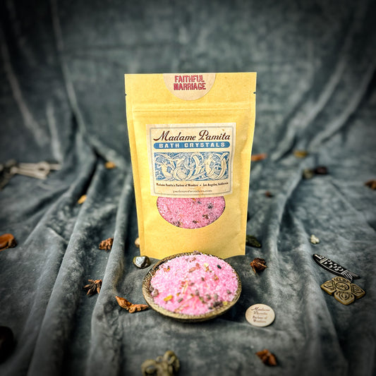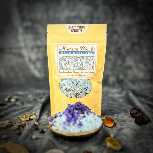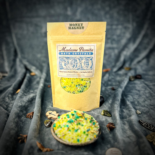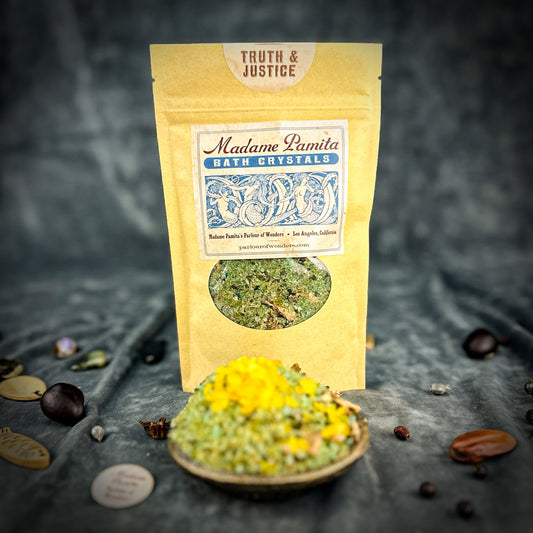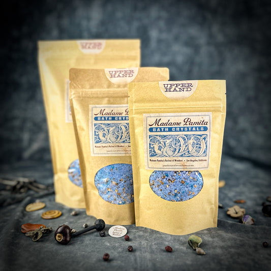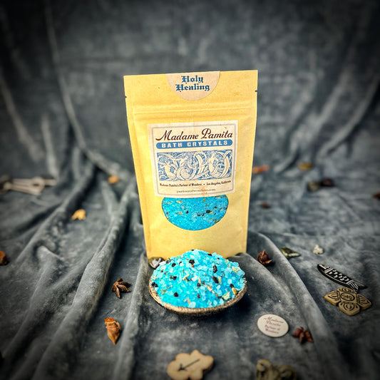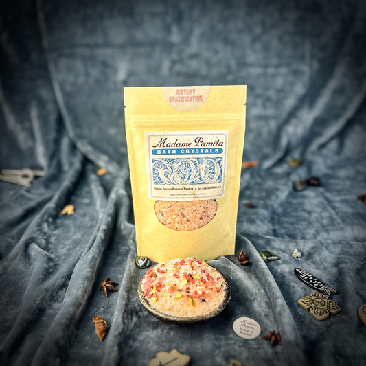 Spiritual Bath Crystals are an old magical tool for cleansing the self, clearing the environment and bringing in better conditions. We formulate our "witchcrafted" Madame Pamita Bath Crystals with the highest quality ingredients – 100% natural sea salt, epsom salts, organic or wild harvested essential oils and herbs and just a light tint with all-natural plant based colorings. All natural materials have strong vibrational qualities and these bath crystals are powerful and extremely effective tools for working your magic.
