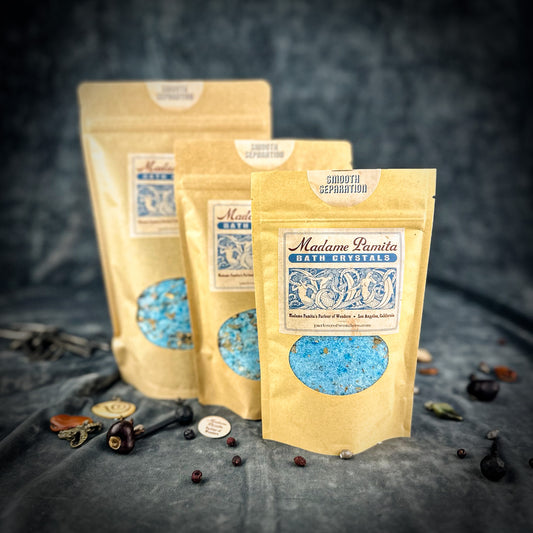 When you see other factory-made bath crystals and bath salts out there that include cheap fragrance, garish colors and no magical herbs, so you'll find our Bath Crystals to be a revelation! For example, our Bath Crystals contain pure sea salt and Epsom salts, essential oils, and herbs. Then we add a touch of phthalate-free perfumer-quality fragrance and a dash of light food-grade color to bring in some extra magic. The proprietary Bath Crystal formulas are created by Madame Pamita and hand-blended right here at the Parlour of Wonders. These crystals are effective tools that help to facilitate clearing and balancing, while encouraging and uplifting your spirit.