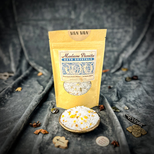 Spiritual Bath Crystals are an old magical tool for cleansing the self, clearing the environment and bringing in better conditions. We formulate our "witchcrafted" Madame Pamita Bath Crystals with the highest quality ingredients – 100% natural sea salt, epsom salts, organic or wild harvested essential oils and herbs and just a light tint with all-natural plant based colorings. All natural materials have strong vibrational qualities and these bath crystals are powerful and extremely effective tools for working your magic.
