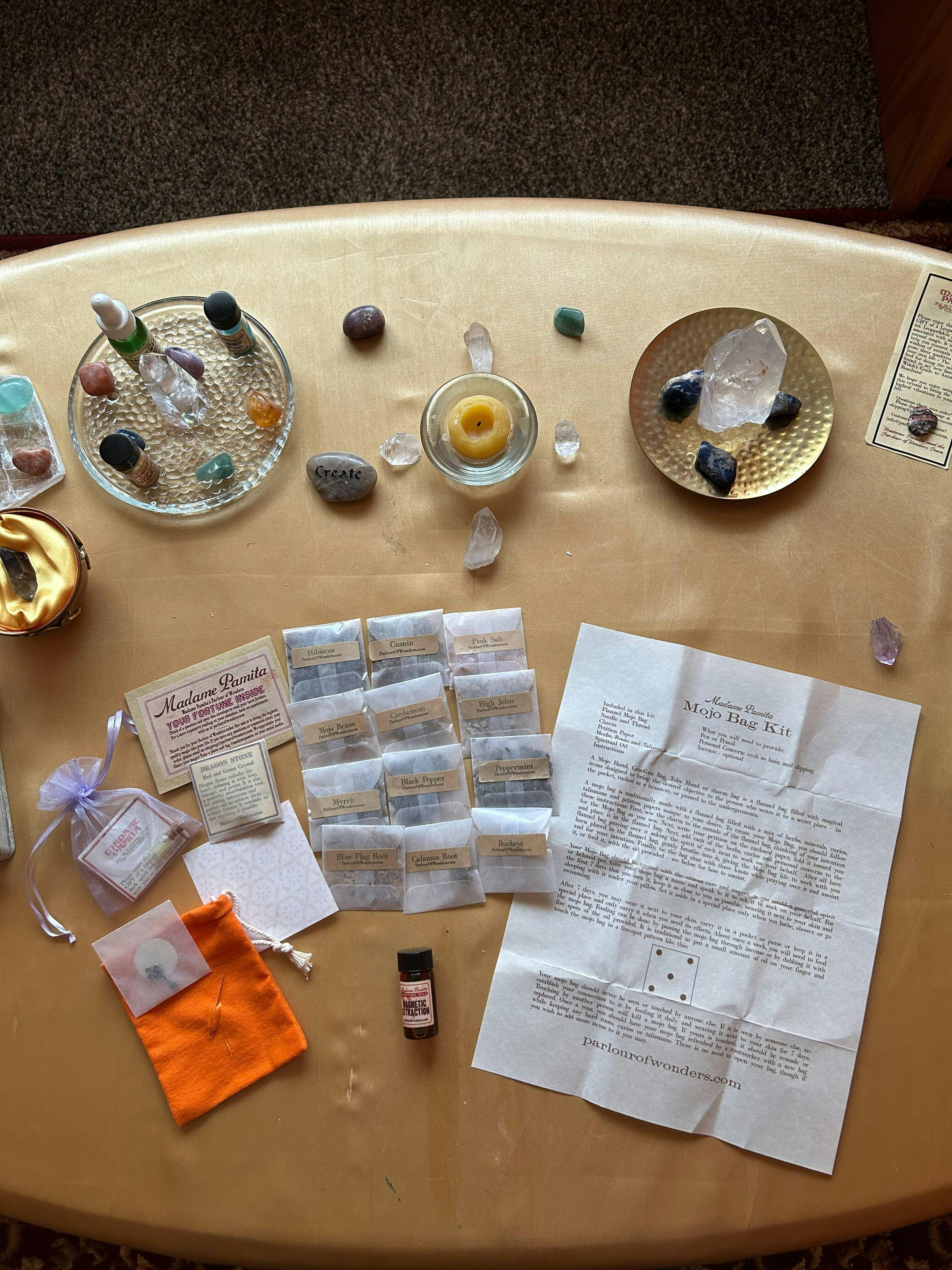 When I ordered the personalized triple strength Mojo Bag Kit from the Parlour of Wonders, I requested ingredients aimed at attracting positive energies while warding off all negative energies. I was pleasantly surprised by the number of items included. The orange flannel bag had a needle and thread in a matching color for attaching the key charm. The contents for the Mojo bag included 13 ingredients. Two bonus items were thoughtfully included with the kit as well. A vial of magic oil was also provided for feeding the Mojo bag. What is really helpful is the instructions that come with the kit are clear and easy to follow.