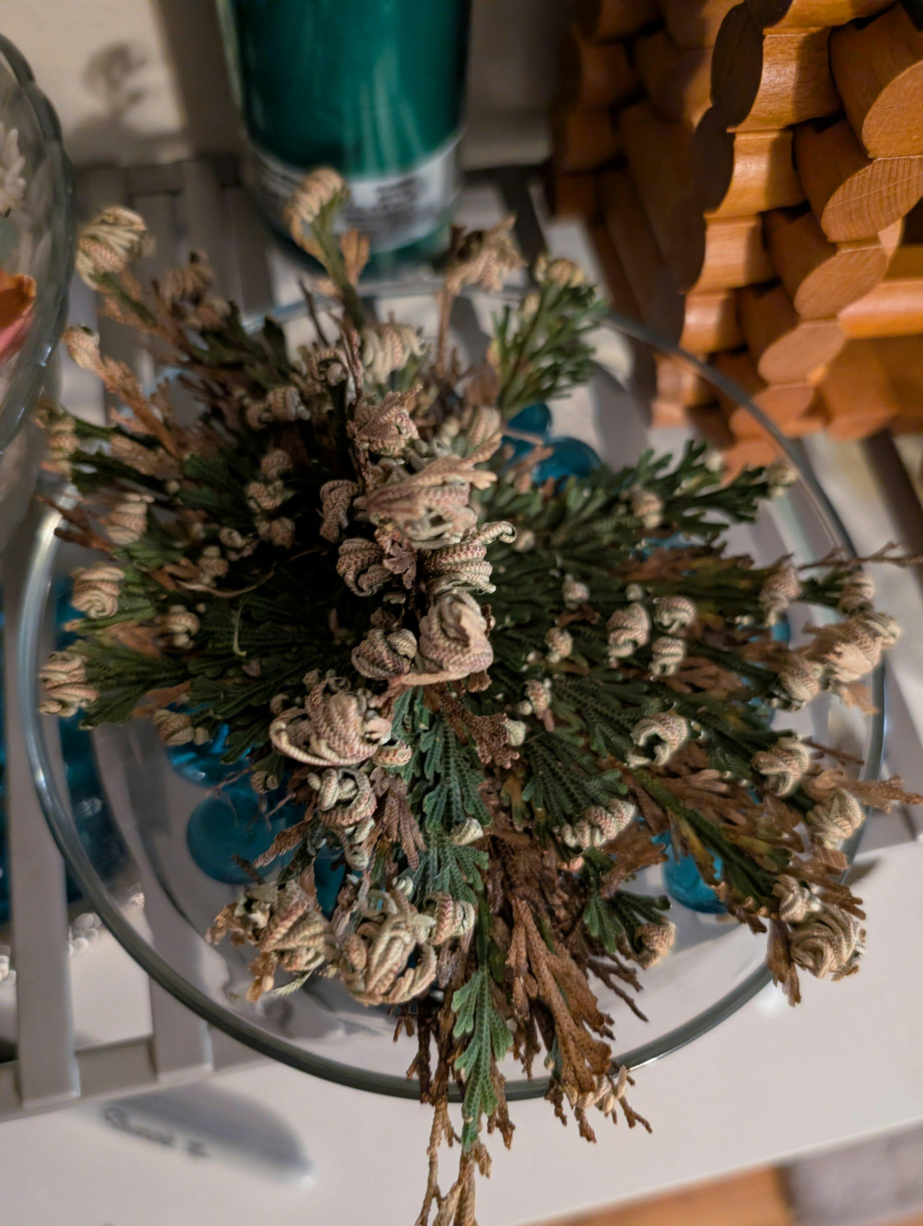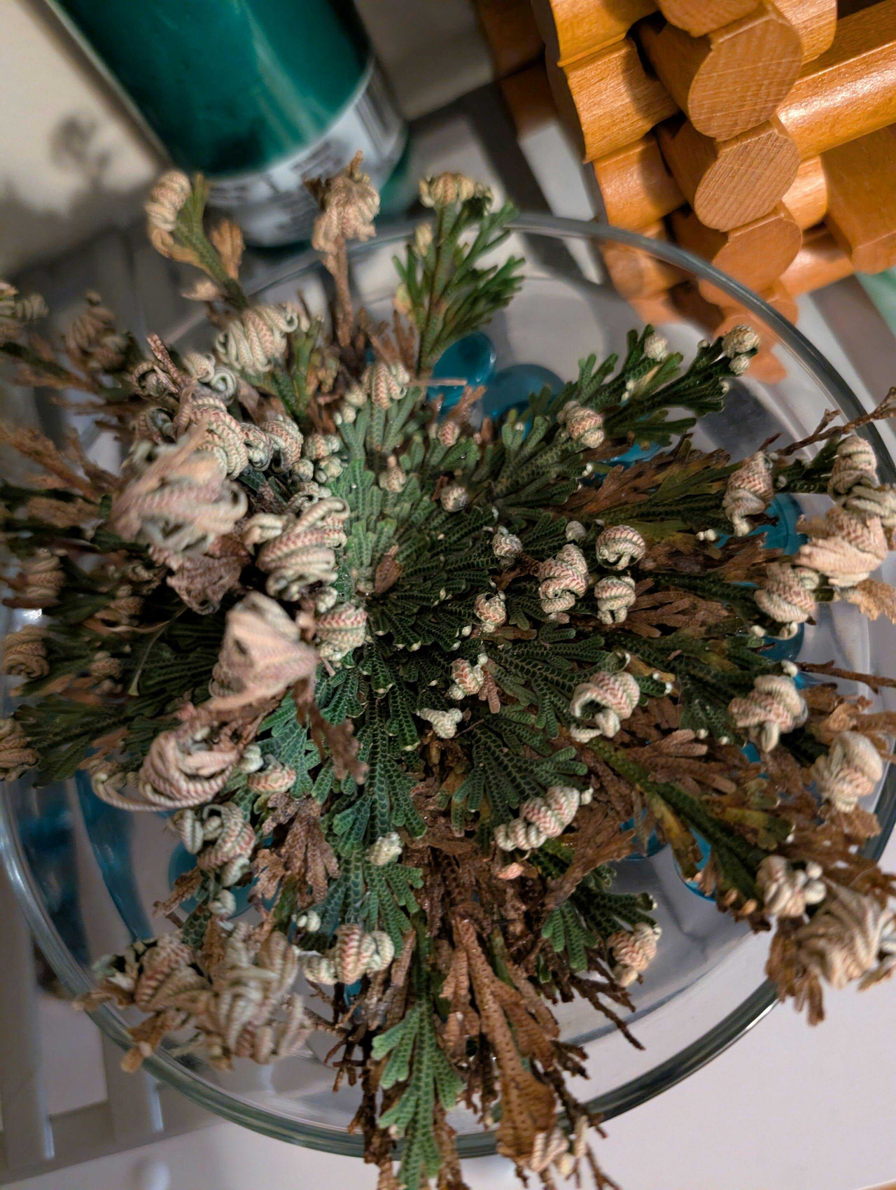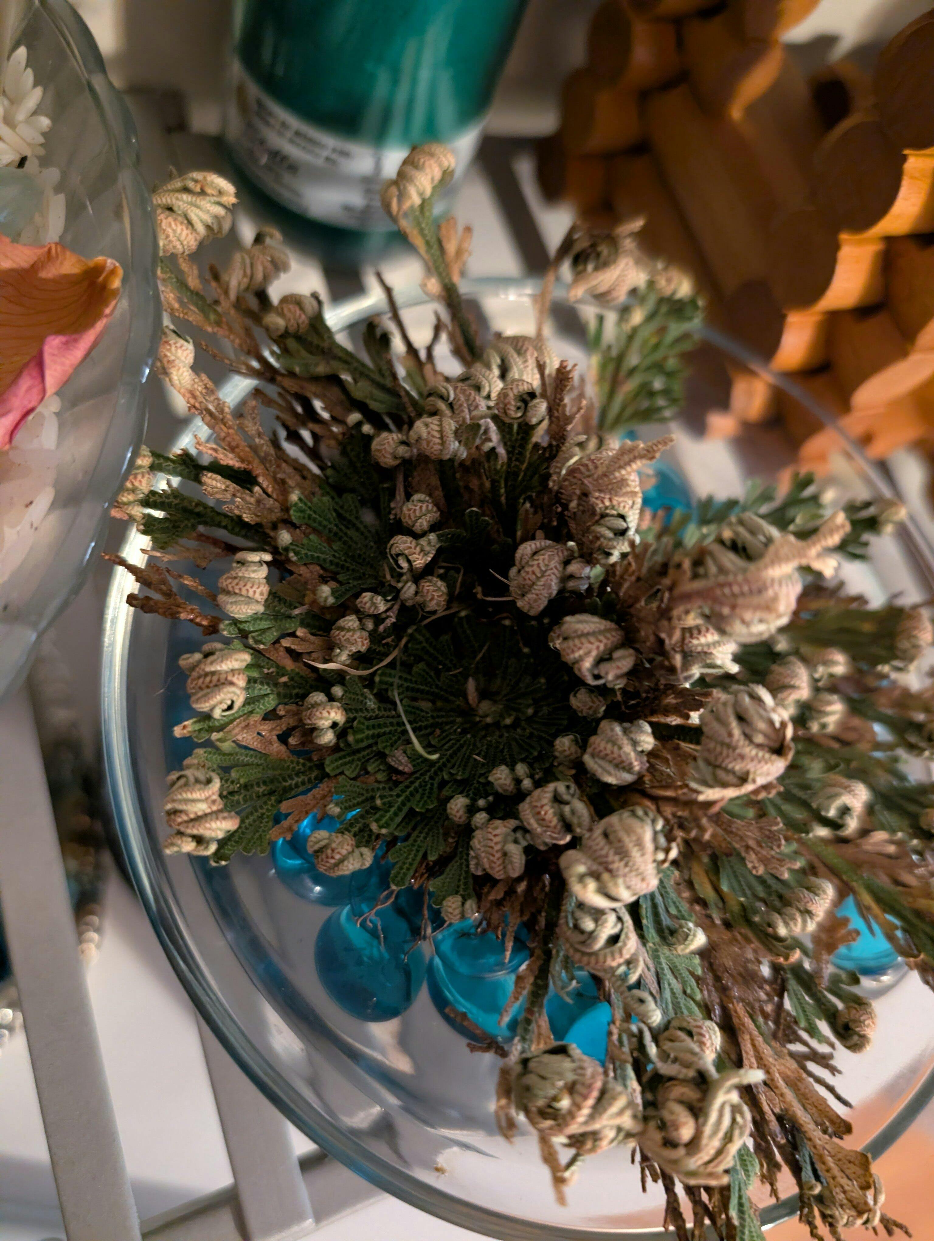 I placed my plant in water a week and a half ago on my house altar and since day one I saw an increase in my own luck as well as work opportunity coming my husband's way. It's been reassuring to have this little guy in our corner! I also noticed that as it opened, the plant has two crown centers instead if just one, which is neat! However, the plant stopped opening after day 1, no matter how much water it was placed in. Instructions said to place it in water only up to its roots and that's what I've tried to do, but its roots are flush with its leaves so I'm not sure if I've been drowning it or not. The water level falls below the roots as the plant drinks so I guess it's fine. The last two days, however, the rose has started turning brown (see pictures). I've read it's a nitrogen deficiency so I'll try to get some fertilizer for it.