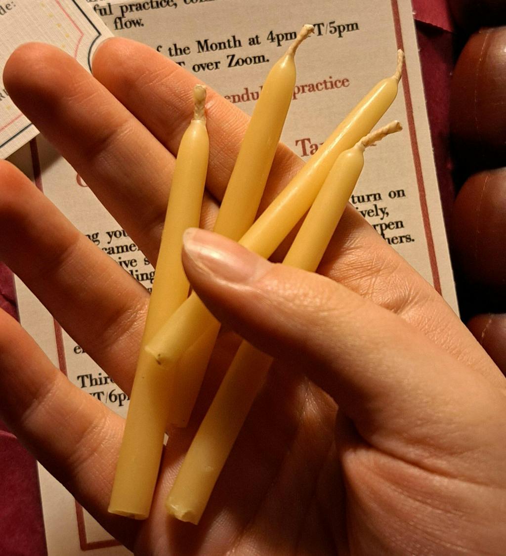 The candles are beautifully made and packaged. They actually appear to be a tiny bit bigger than standard birthday candles, which is amazing because that makes them sturdier and more substantial. They burn beautifully, and they're great for anything from making charms for putting in spell bags, to charging spells with energy over a specific period of time. I've also used them with other candles to add layers of energy, create custom color combinations with melted wax, and form sigils and shapes on the outside of bigger candles. I highly recommend these! ♡